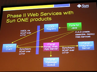 ウェルズ副社長は、「フェーズ1は、ウェブサービスをJavaで作成し、iPlanetポータルサーバー上で動かすという図式になる。ここはまだテスト段階だ。フェーズ2になるといよいよUDDIが出てくる。ただ、まだセキュリティの問題があるのですべてはファイアーウォールの内側だ。従業員や特定のパートナーなどのしっかりした信頼関係があるなかでの利用になるだろう。しかし、UDDIにより利用可能なウェブサービスが登録されるので本格的なアプリケーションの構築が可能だ。フェーズ3では、UDDIがファイアーウォールの外に出る。つまり、他社が開発したウェブサービスを共有財産として活用できるようになるわけで、B2BあるいはB2Cのウェブサービスが完全な形でスタートすることになる」と解説した。