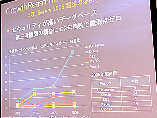 とくにセキュリティ面では、第三者機関の調査においてSQLサーバー2005は昨年と一昨年の2年連続でぜい弱性がゼロ。対して、昨年にオラクルは54件、DB2は4件、MySQLは14件、Sybaseには2件のぜい弱性が発見されているということだ。